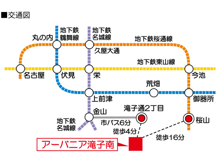 名古屋市営鶴舞線 『 荒畑駅 』 徒歩19分 名古屋市営名城線 『 金山駅 』 駅までバスで6分 バス停『滝子通二丁目』 徒歩4分 |