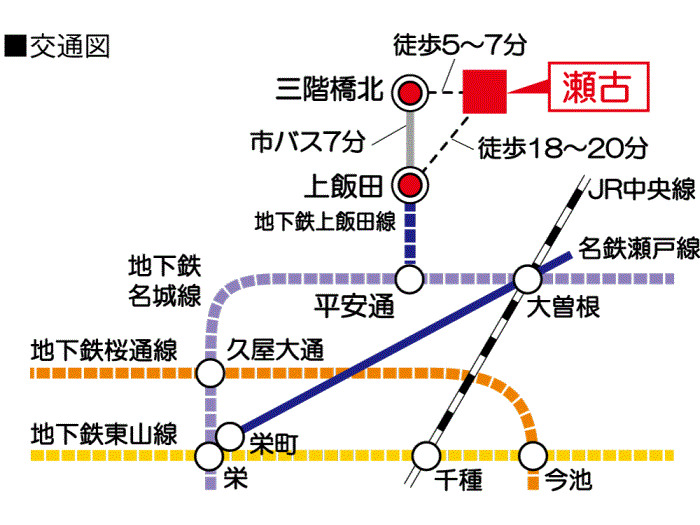 名古屋市営上飯田線 『 上飯田駅 』 徒歩18分 名古屋市営名城線 『 大曽根駅 』 駅までバスで17分 バス停『三階橋北』 徒歩5分 |