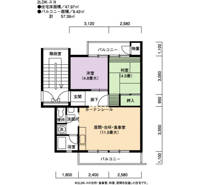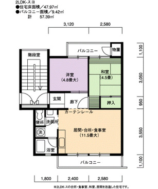 | 間取り | 2LDK | 床面積 | 47㎡ |