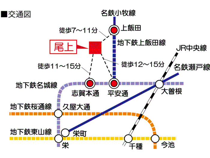 名古屋市営上飯田線 『 上飯田駅 』 徒歩7分 名古屋市営東山線 『 栄駅 』 駅までバスで18分 バス停『瑠璃光町』 徒歩2分 |