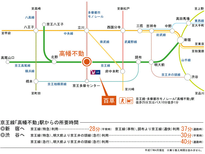 京王線 『 高幡不動駅 』 駅までバスで7分 バス停『百草センター』 徒歩1分 京王線 『 聖蹟桜ヶ丘駅 』 駅までバスで14分 バス停『百草センター』 徒歩1分 京王相模原線 『 京王多摩センター駅 』 駅までバスで9分 バス停『百草センター』 徒歩2分 |