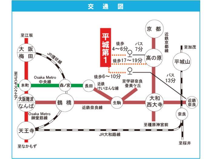 近鉄京都線 『 高の原駅 』 駅までバスで7分 バス停『神功四丁目』 徒歩4分 近鉄難波・奈良線 『 近鉄奈良駅 』 駅までバスで13分 バス停『神功4丁目』 徒歩6分 |