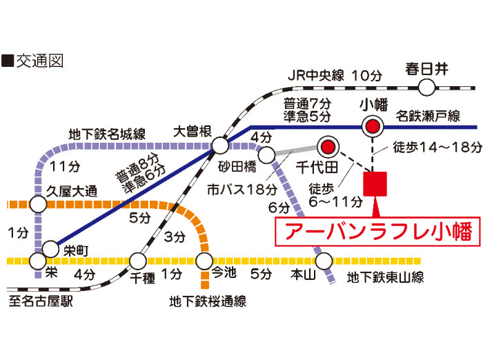 名古屋市営名城線 『 砂田橋駅 』 駅までバスで8分 バス停『千代田』 徒歩6分 |