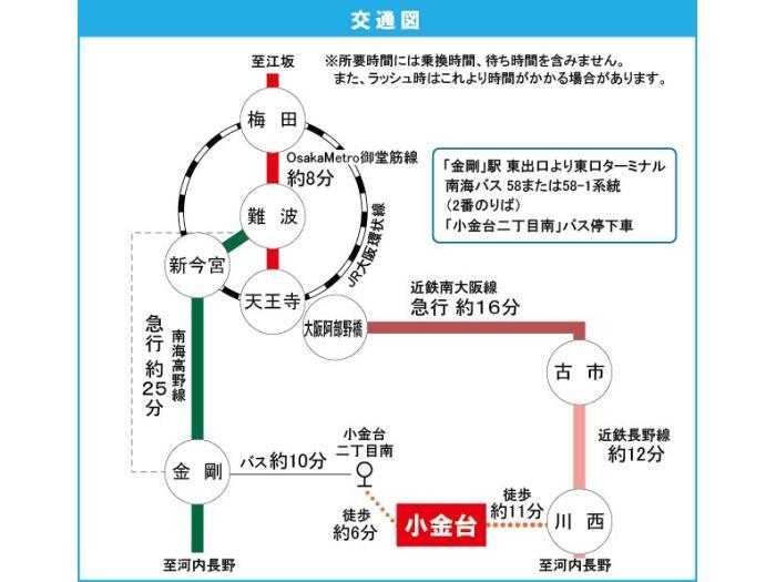 南海高野線 『 金剛駅 』 駅までバスで10分 バス停『小金台二丁目南 』 徒歩7分 近鉄長野線 『 滝谷不動駅 』 徒歩25分 近鉄長野線 『 川西駅 』 徒歩11分 |