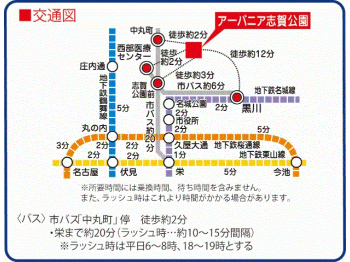 名古屋市営鶴舞線 『 庄内通駅 』 徒歩17分 名古屋市営名城線 『 栄駅 』 駅までバスで14分 バス停『志賀公園前』 徒歩3分 |