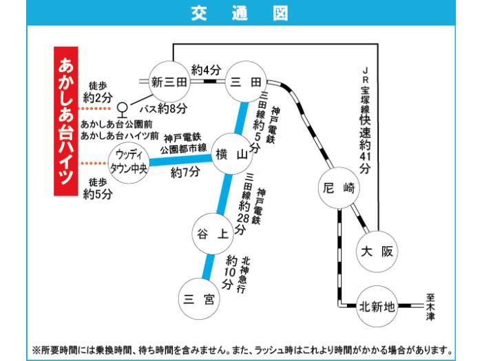 JR福知山線 『 新三田駅 』 駅までバスで8分 バス停『あかしあ台ハイツ前』 徒歩1分 神鉄公園都市線 『 南ウッディタウン駅 』 駅までバスで2分 バス停『あかしあ台公園前』 徒歩1分 |