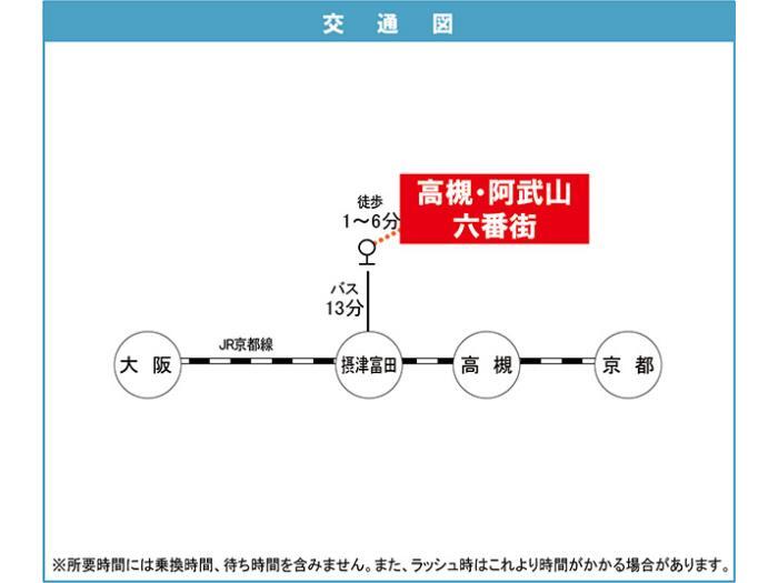 JR 東海道・山陽本線 『 高槻駅 』 駅までバスで35分 バス停『公団阿武山』 徒歩1分 阪急京都線 『 富田駅 』 駅までバスで33分 バス停『公団阿武山』 徒歩1分 |