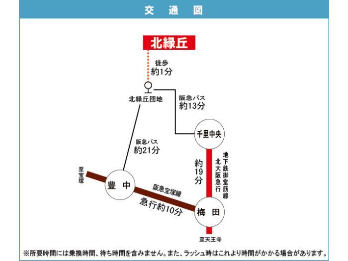 阪急宝塚線 『 豊中駅 』 駅までバスで21分 バス停『北緑丘団地』 徒歩1分 大阪モノレール 『 千里中央駅 』 駅までバスで13分 バス停『北緑丘団地』 徒歩1分 |