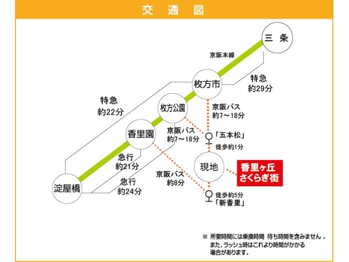 京阪本線 『 香里園駅 』 駅までバスで10分 バス停『新香里』 徒歩6分 京阪本線 『 枚方市駅 』 駅までバスで18分 バス停『五本松』 徒歩2分 |