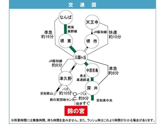 JR阪和線 『 津久野駅 』 駅までバスで8分 バス停『鈴の宮団地センター』 徒歩1分 JR阪和線 『 富木駅 』 徒歩29分 |
