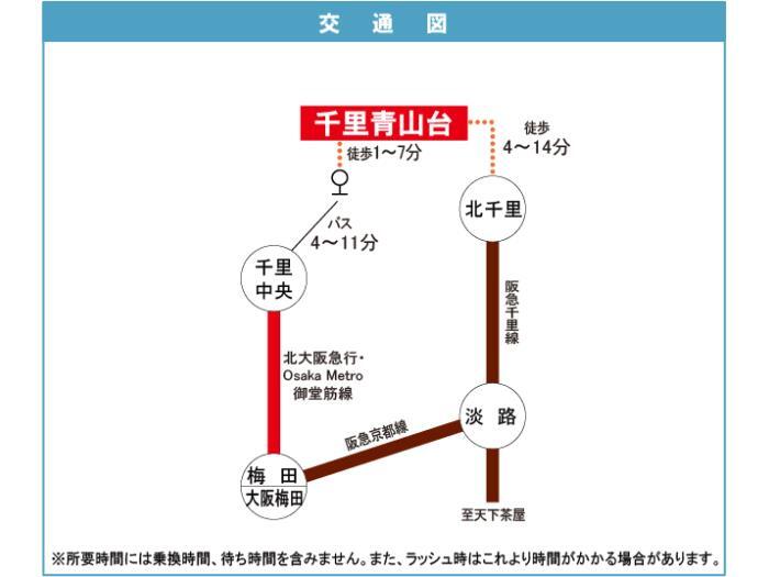 北大阪急行電鉄 『 千里中央駅 』 徒歩17分 大阪モノレール 『 千里中央駅 』 駅までバスで4分 バス停『青山台四丁目』 徒歩1分 |