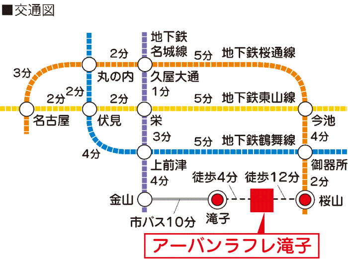 名古屋市営名城線 『 金山駅 』 駅までバスで10分 バス停『滝子』 徒歩4分 名古屋市営名城線 『 栄駅 』 駅までバスで22分 バス停『滝子』 徒歩4分 |