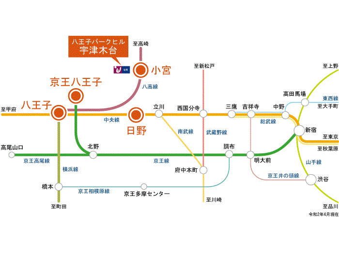 JR中央線 『 八王子駅 』 駅までバスで22分 バス停『宇津木台中央』 徒歩3分 京王線 『 京王八王子駅 』 駅までバスで22分 バス停『宇津木台中央』 徒歩3分 JR八高線 『 小宮駅 』 徒歩11分 |