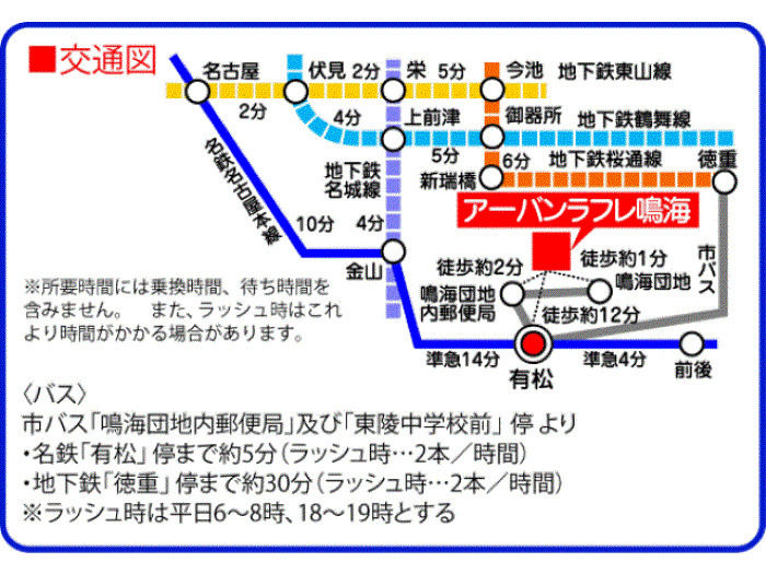 名鉄名古屋本線 『 有松駅 』 駅までバスで8分 バス停『鳴海団地内郵便局』 徒歩1分 名古屋市営桜通線 『 徳重駅 』 駅までバスで37分 バス停『鳴海団地内郵便局』 徒歩1分 |