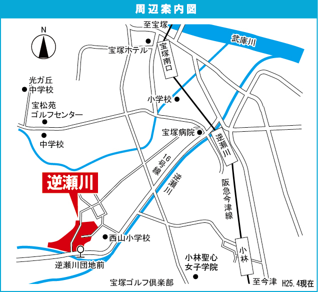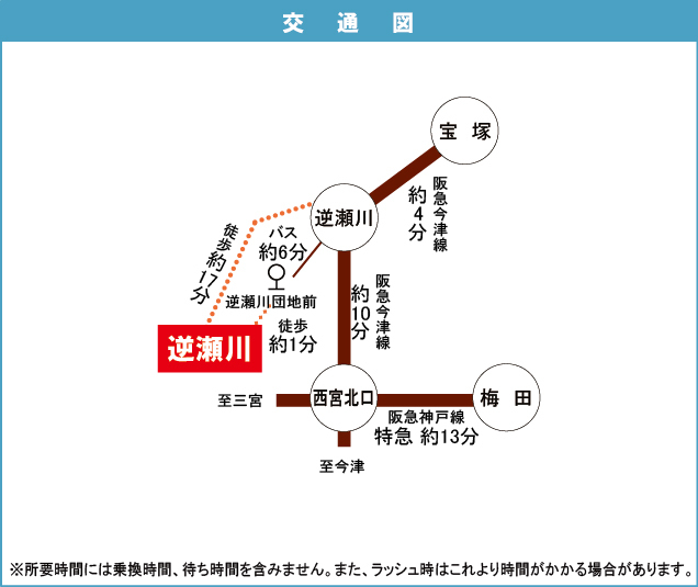 阪急今津線 『 小林駅 』 徒歩16分 阪急今津線 『 逆瀬川駅 』 駅までバスで3分 バス停『逆瀬川団地前 』 徒歩2分 |