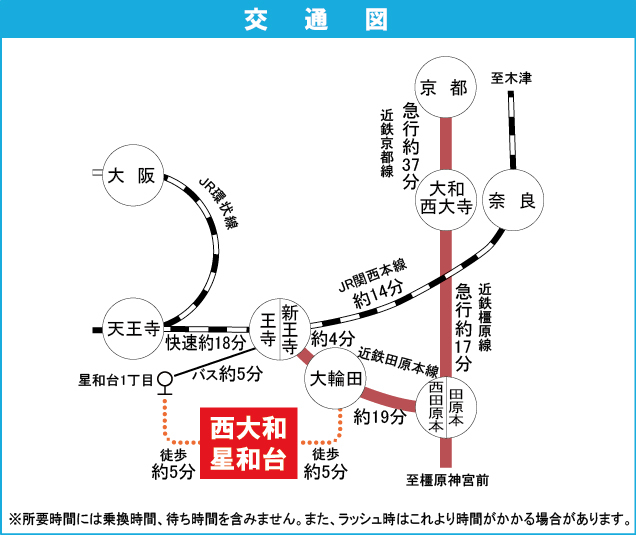 JR関西本線 『 王寺駅 』 駅までバスで5分 バス停『星和台一丁目』 徒歩5分 JR関西本線 『 王寺駅 』 徒歩26分 |