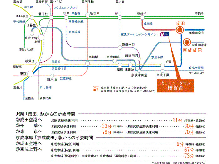 JR成田線 『 成田駅 』 駅までバスで7分 バス停『橋賀台保育園』 徒歩2分 京成本線 『 公津の杜駅 』 徒歩23分 |
