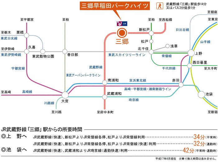 JR武蔵野線 『 三郷駅 』 駅までバスで3分 バス停『早稲田七丁目南』 徒歩1分 JR武蔵野線 『 新三郷駅 』 徒歩25分 |