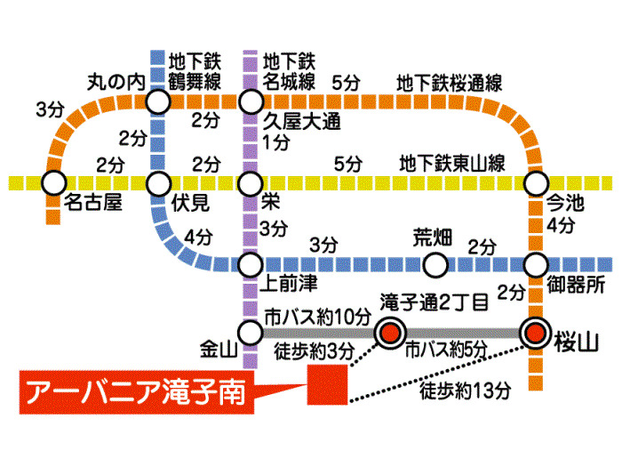 名古屋市営鶴舞線 『 荒畑駅 』 徒歩19分 名古屋市営名城線 『 金山駅 』 駅までバスで6分 バス停『滝子通二丁目』 徒歩4分 |