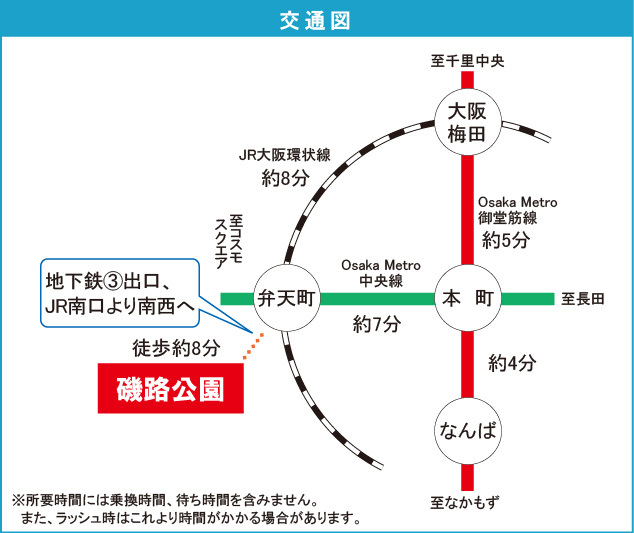 JR大阪環状線 『 弁天町駅 』 徒歩11分 大阪市営中央線 『 朝潮橋駅 』 徒歩16分 |