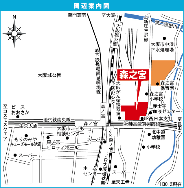 JR大阪環状線 『 大阪城公園駅 』 徒歩15分 大阪市営中央線 『 森ノ宮駅 』 徒歩5分 |