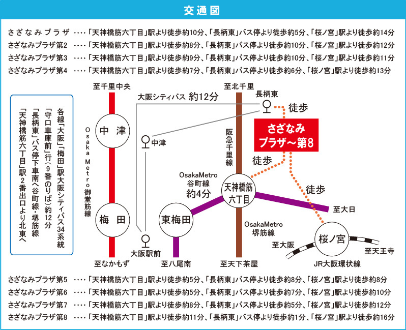 大阪市営堺筋線 『 天神橋筋六丁目駅 』 徒歩11分 JR大阪環状線 『 大阪駅 』 駅までバスで10分 バス停『長柄東』 徒歩2分 |