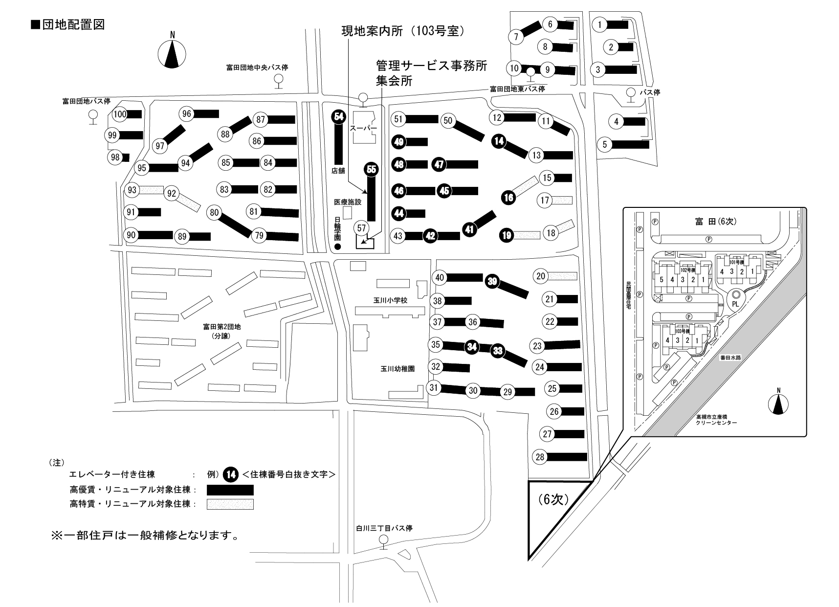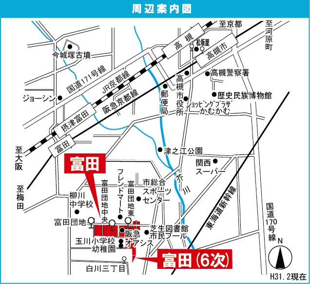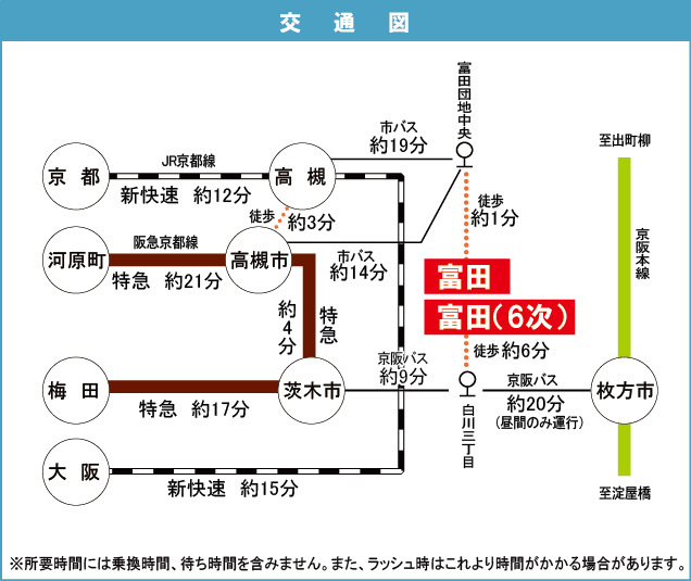 JR 東海道・山陽本線 『 高槻駅 』 駅までバスで20分 バス停『富田団地中』 徒歩2分 阪急京都線 『 茨木市駅 』 駅までバスで15分 バス停『白川三丁目』 徒歩6分 |
