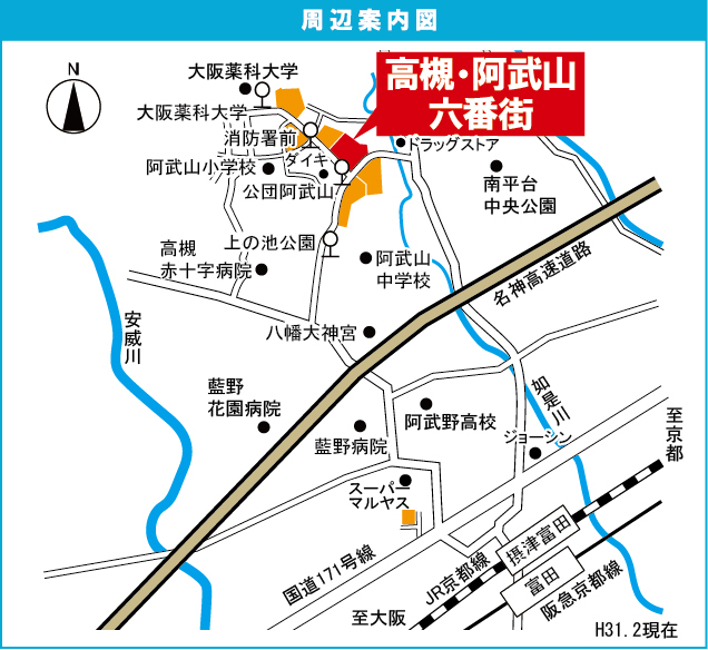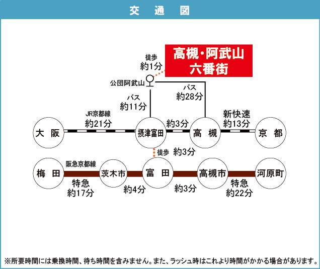 JR 東海道・山陽本線 『 高槻駅 』 駅までバスで35分 バス停『公団阿武山』 徒歩1分 阪急京都線 『 富田駅 』 駅までバスで33分 バス停『公団阿武山』 徒歩1分 |