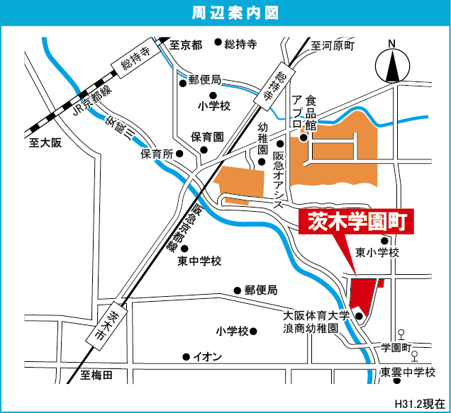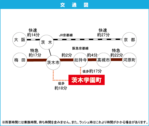 阪急京都線 『 茨木市駅 』 徒歩21分 JR 東海道・山陽本線 『 茨木駅 』 駅までバスで17分 バス停『学園町』 徒歩6分 |