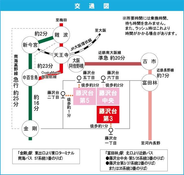 近鉄長野線 『 富田林駅 』 駅までバスで15分 バス停『藤沢台一丁目』 徒歩2分 近鉄長野線 『 富田林西口駅 』 徒歩25分 |