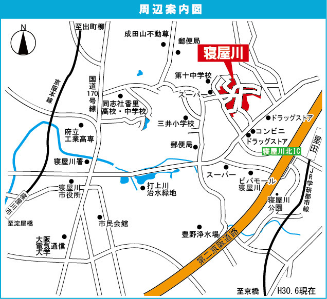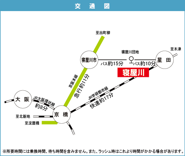 京阪本線 『 寝屋川市駅 』 駅までバスで17分 バス停『寝屋川団地』 徒歩1分 JR東西線 『 星田駅 』 駅までバスで10分 バス停『寝屋川団地』 徒歩1分 京阪本線 『 香里園駅 』 徒歩30分 |