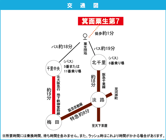 北大阪急行電鉄 『 千里中央駅 』 駅までバスで18分 バス停『粟生団地』 徒歩1分 |