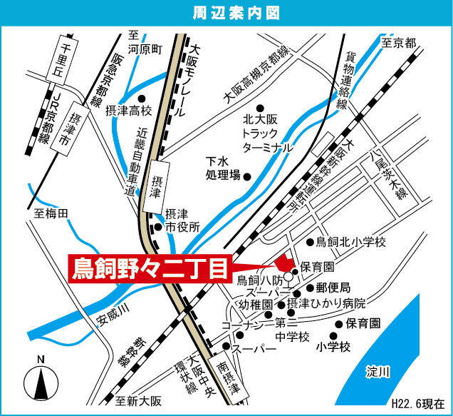 阪急京都線 『 摂津市駅 』 駅までバスで13分 バス停『鳥飼八防』 徒歩2分 大阪モノレール 『 南摂津駅 』 徒歩19分 |
