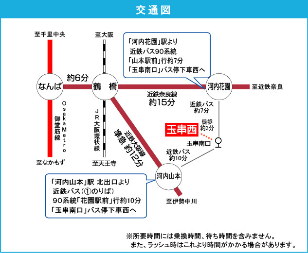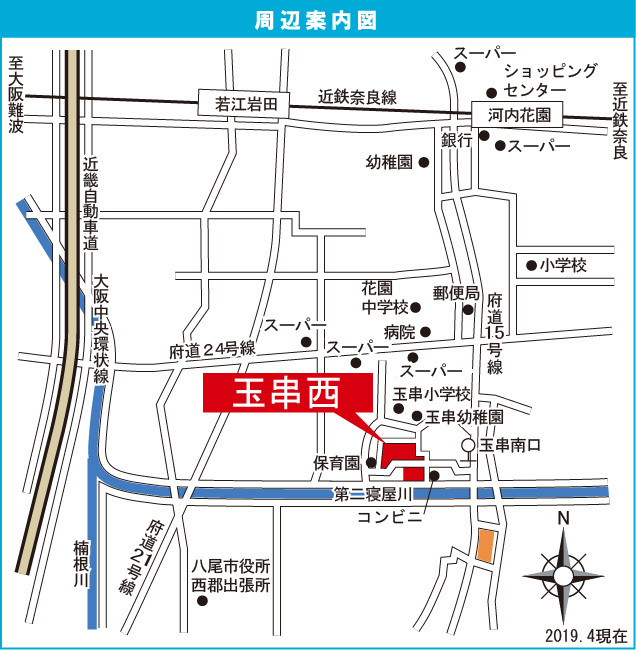 近鉄奈良線 『 若江岩田駅 』 徒歩25分 近鉄大阪線 『 河内山本駅 』 駅までバスで15分 バス停『玉串南口』 徒歩3分 |