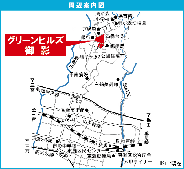 阪急神戸線 『 御影駅 』 駅までバスで9分 バス停『公団住宅前』 徒歩1分 |