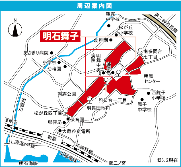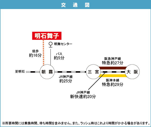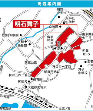 JR神戸線 『 朝霧駅 』 駅までバスで2分 バス停『明舞センター前』 徒歩2分 JR神戸線 『 明石駅 』 駅までバスで15分 バス停『明舞センター前』 徒歩1分 |
